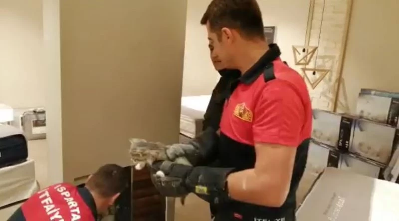 Isparta’da bir iş yerinin kolon kısmına sıkışan kedi, itfaiye ekiplerince kurtarıldı.