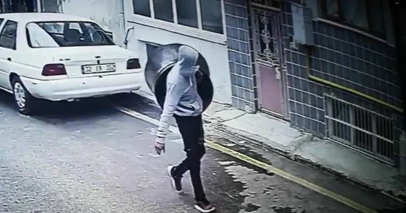 Hassan A.’nın kazanı çaldıktan sonra kaçış anı bir işyerinin güvenlik kamerasına yansıdı. Görüntülerde Hassan A.’nın omuzladığı kazan ile sokakta hızlıca yürüdüğü görüldü.