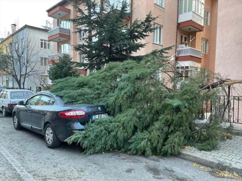 Isparta'da kuvvetli rüzgar nedeniyle devrilen ağaç, otomobile zarar verdi