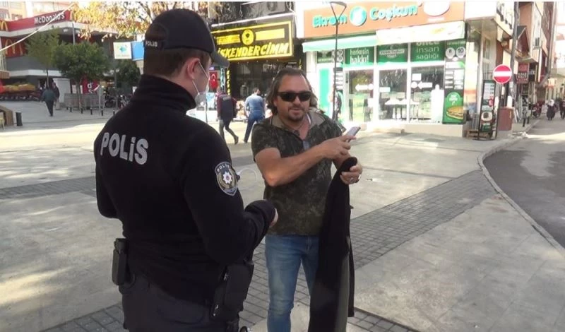 Kaymakkapı Meydanı’ndaki denetimde maskesiz bir şekilde cep telefonuyla konuşarak gelen bir şahsı, polisler durdurdu. Polisin “Beyefendi maskeniz yok mu” sorusuna şahıs, “Telefonla konuşuyordum, o yüzden çıkardım. Yemek yedim, telefonla konuşuyorum diye çıkardım. Aslında daldım, kusura bakmayın. Hemen takıyorum. Çok özür diliyorum” diyerek yanıt verdi. Cebinden çıkardığı maskeyi takan şahıs hakkında maske takmamaktan dolayı işlem yapıldı.