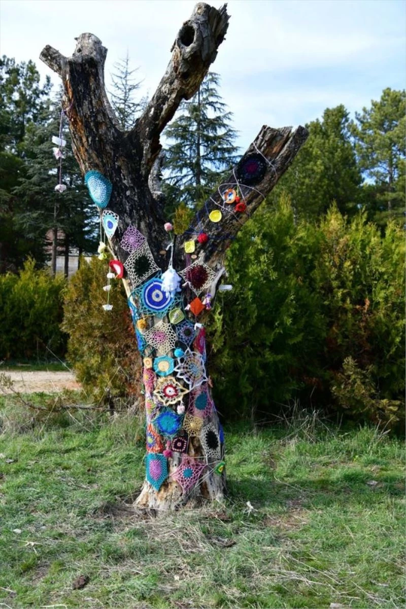 ISPARTA (AA) - Isparta'nın Atabey ilçesindeki tarihi Ertokuş Medresesi'nin bahçesinde kuruyan ağaçlar, kadınlar tarafından örgü ile kaplanarak süslendi.