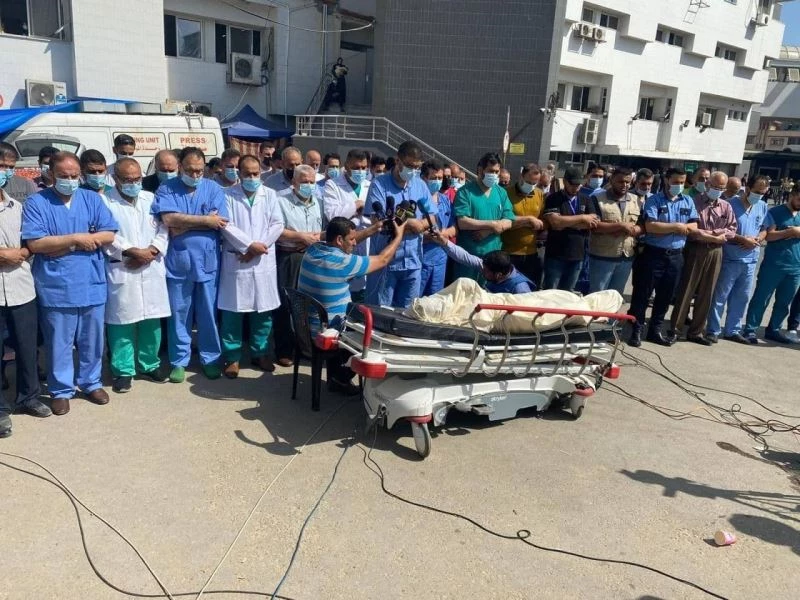 Filistin Sağlık Bakanlığı yetkilileri ve doktorlar, bugün öğle saatlerinde Dr. Eymen Ebu Avf’un cenaze namazını kıldı.