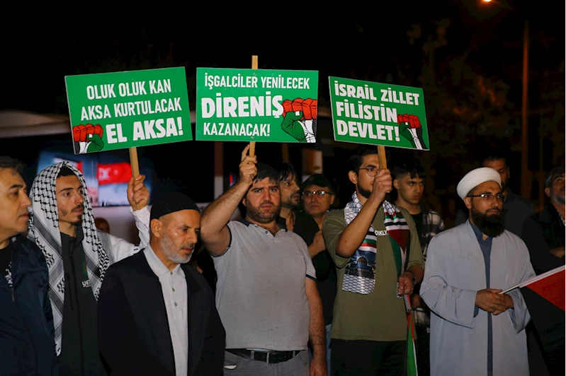 Ellerinde çeşitli döviz ve pankartlar bulunan, Filistin ile Türk bayrakları taşıyan vatandaşlar, İsrail aleyhine sloganlar attı, tekbir getirdi.