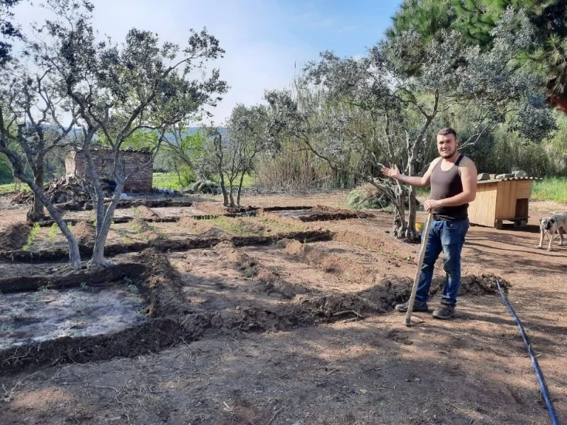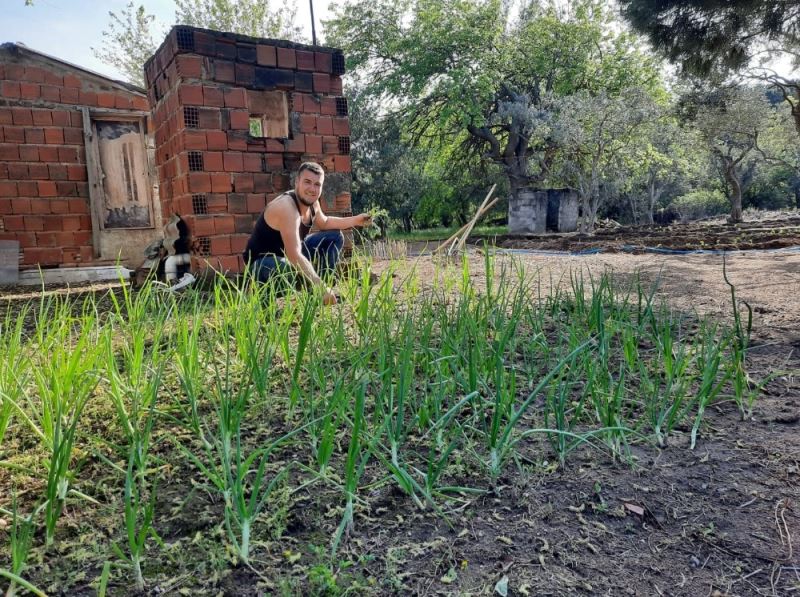 Erdek’te bir kafede çalışırken, korona virüs önlemleri kapsamında çalıştığı işyerinin kapanmasıyla işsiz kalan 27 yaşındaki Eray Kaplan, boş vakitlerini değerlendirmek evinin bahçesinde ki toprağı işliyor.