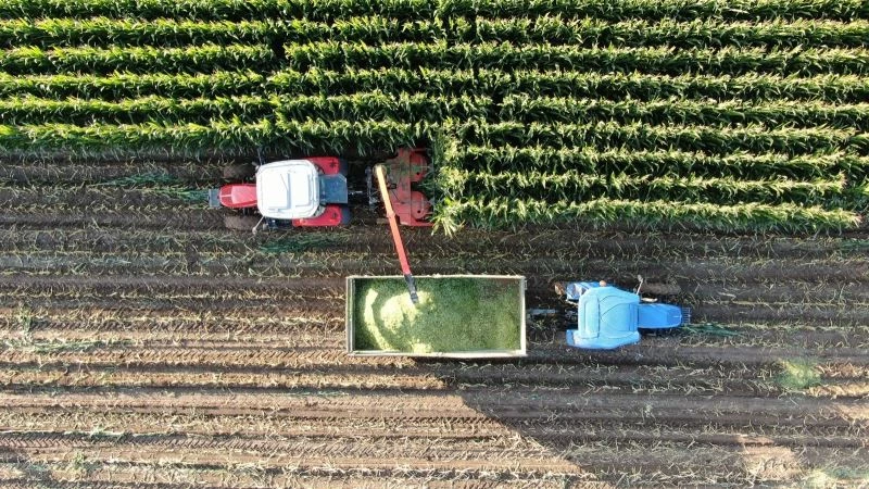 Sivas’ın Yıldızeli ilçesine bağlı Mumcuçiftiliği köyünde vatandaşların birçoğu geçimini mısır üretiminden sağlıyor. Mayıs ayında farklı bölgelerde toplam 300 dönümlük alana ekimi yapılan silajlık mısırlar yeterli olgunluğa erişti. Büyükbaş hayvanların iştah ve süt verimini arttıran silajlık mısırın hasadına da bugünlerde başlandı. Mısır silaj makinası yardımıyla hasat edilen mısırlar paketleme yapılarak satışa sunuluyor. 15 gün sürecek olan silajlık mısır hasadı drone ile havadan görüntülendi.