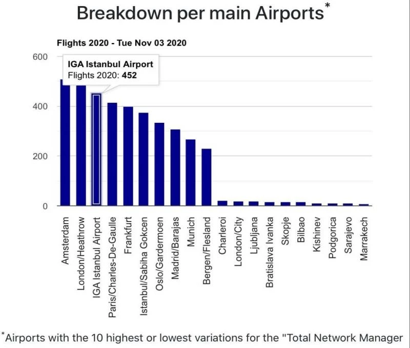 Avrupa Hava Seyrüsefer Güvenliği Örgütü (Eurocontrol)’ün verilerine göre İstanbul Havalimanı, Amsterdam Schiphol ve Londra Heathrow Havalimanları’ndan sonra en fazla uçuş gerçekleştirilen havalimanı oldu. Geçtiğimiz hafta günde ortalama 520 hareket sayısına ulaşan İstanbul Havalimanı, Türkiye’de en fazla uçuş gerçekleştirilen havalimanı oldu. 3 Kasım Salı günü verilerine göre ise İstanbul Havalimanı, 452 uçuşla Avrupa’da en yoğun trafiğe sahip üçüncü havalimanı oldu.