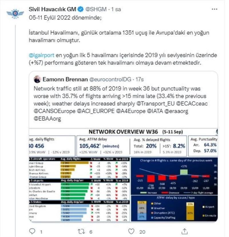 Avrupa Hava Seyrüsefer Güvenliği Teşkilatı (EUROCONTROL)’nın 05-11 Eylül tarihlerini ilişkin detaylı uçuş verilerini yayınladı. Buna göre İstanbul Havalimanı Avrupa’daki en yoğun meydanlar arasında zirvedeki yerini korudu. Uçuş verileri, Sivil Havacılık Genel Müdürlüğü(SHGM)) tarafından da paylaşıldı.