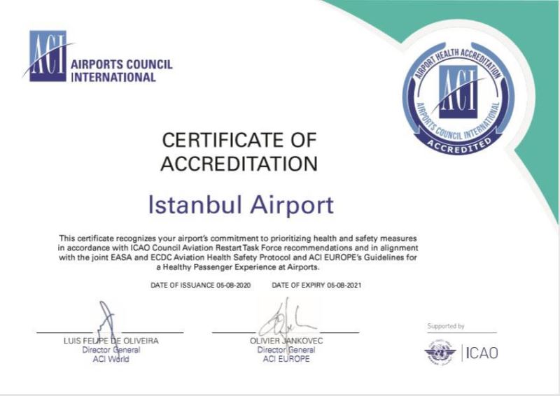 Covid-19 salgını sonrasında aldığı sıkı sağlık önlemleriyle ilk olarak Sivil Havacılık Genel Müdürlüğü’nün vermiş olduğu ‘Havalimanı Pandemi Sertifikası, ardından Avrupa Birliği Havacılık Emniyeti Ajansı’nın (EASA) yayınladığı ‘Covid-19 Havacılık Sağlık Emniyeti Protokolünü’ imzalayan İstanbul Havalimanı, uluslararası yeni bir sertifikayı daha alarak aldığı önlemleri tescilledi. Uluslararası Havalimanları Konseyi (ACI) tarafından verilen ‘Havalimanı Sağlık Akreditasyonu’ sertifikasını alan İstanbul Havalimanı, dünyada bu sertifikayı alan ilk havalimanı oldu.