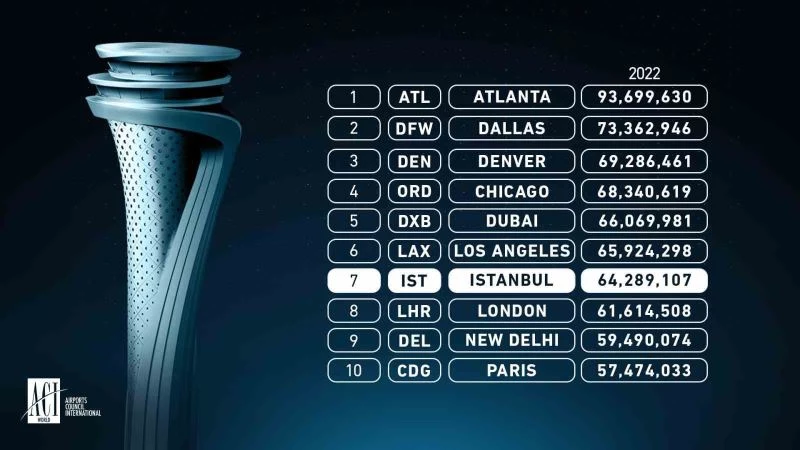 İstanbul Havalimanı, Uluslararası Havalimanları Konseyi’nin yayınladığı listede 2022 yılında dünyanın en yoğun 10 havalimanları arasında 7’nci sırada yer aldı.