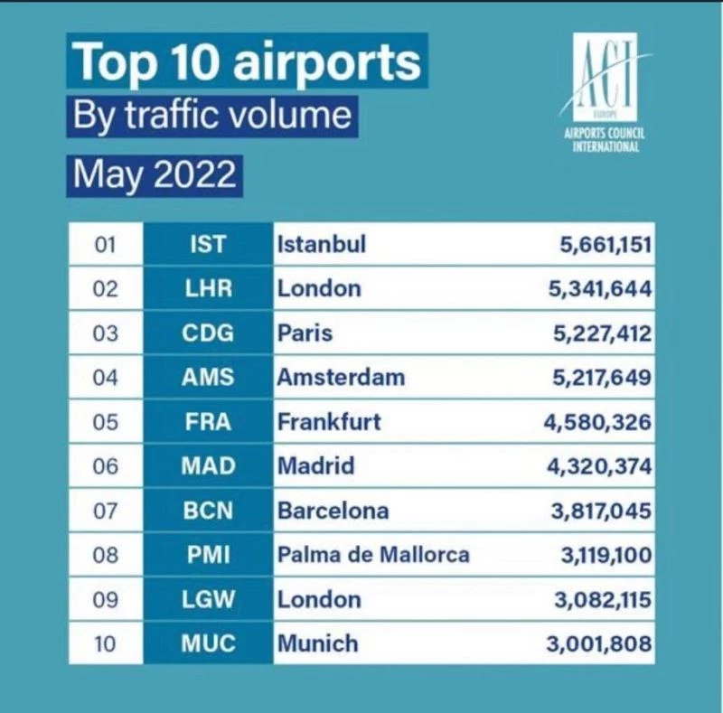 İGA İstanbul Havalimanı Mayıs ayında ağırladığı 5 milyon 661 bin 151 yolcu ile Avrupa genelinde havalimanları arasında ilk sırada yer aldı. İGA İstanbul Havalimanı’nı, 5 milyon 341 bin 644 yolcu ile Londra, 5 milyon 227 bin 412 yolcu ile Paris Charles De Gulle takip etti. Twitterdan açıklama yapan İGA CEO’su Kadri Samsunlu, "Avrupa’da Mayıs ayının birincisi. Havacılığın dünyada gündemi beklenenden güçlü talep artışı ve başta güvenlik ve yer hizmetlerinde olmak üzere personel eksiklikleri sonucu havalimanlarında oluşan kuyruklar, yaşanan grevler, yığılan bavullar. Bizde de kuyruk var” dedi.