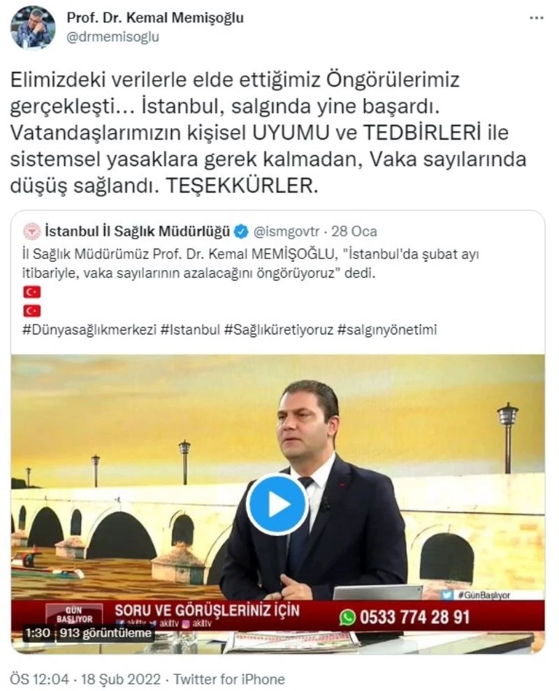 İstanbul İl Sağlık Müdürü Prof. Dr. Kemal Memişoğlu sosyal medya hesabı üzerinden “Elimizdeki verilerle elde ettiğimiz Öngörülerimiz gerçekleşti. İstanbul, salgında yine başardı” ifadelerini kullandı.