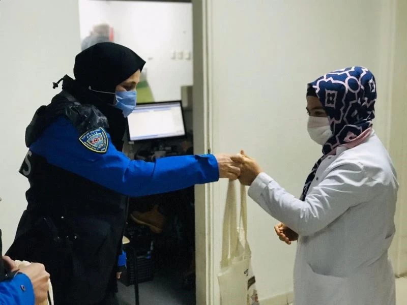 Polisleri karşılarında gören sağlık çalışanları ise emniyet mensuplarına bu ziyaretten ötürü teşekkür etti.