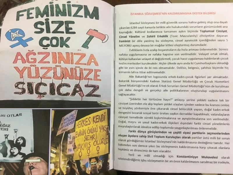Bir dernek tarafından gönderildiği öğrenilen kitapçıkta, İstanbul Sözleşmesi’nin kaldırılmasına destek bildirisi yer alıyor. İstanbul Sözleşmesi’nin milli güvenlik sorunu haline geldiği iddia edilerek, 6284 sayılı kanunun alile hukukundaki sorunların ana kaynağı olarak ifade ediliyor. Kitapçıkta, resimlerle ve grafiklerle açıklama yapılıyor. Aile Koruma Kanunu eleştirilerek, feminizm ana hatlarıyla anlatılıyor ve İstanbul Sözleşmesi’nin neden iptal edilmesi gerektiği anlatılıyor.