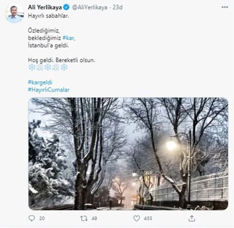 İstanbul Valisi Ali Yerlikaya, kar fotoğrafı paylaşarak, “Özlediğimiz, beklediğimiz kar, İstanbul’a geldi. Hoş geldi. Bereketli olsun” ifadelerini kullandı.