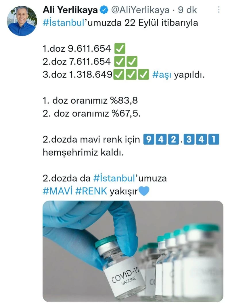 Sosyal medya hesabı Twitter’dan açıklama yapan İstanbul Valisi Ali Yerlikaya, "İstanbul’umuzda 22 Eylül itibarıyla 1. doz 9 milyon 611 bin 654, 2. doz 7 milyon 611 bin 654, 3. doz 1 milyon 318 bin 649 aşı yapıldı. 1. doz oranımız yüzde 83,8, 2. doz oranımız yüzde 67,5. 2. dozda mavi renk için 942 bin 341 hemşehrimiz kaldı. 2. dozda da İstanbul’umuza mavi renk yakışır" ifadelerini kullandı.