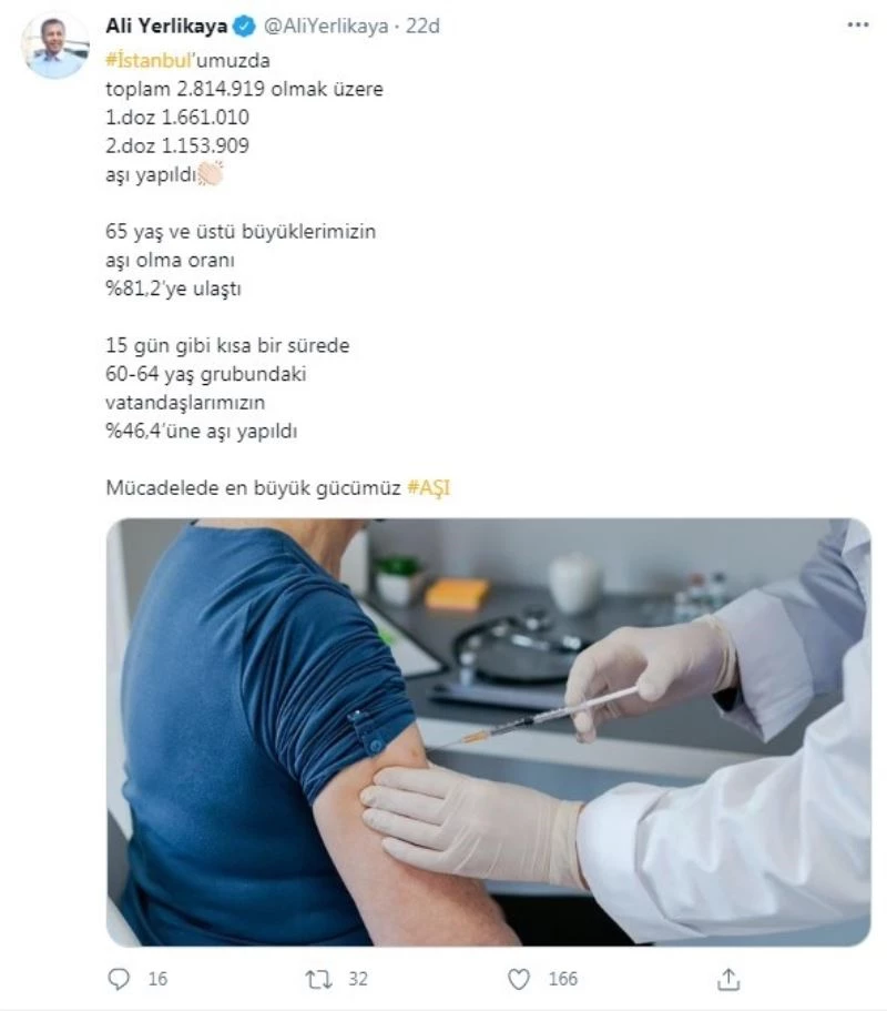 İstanbul Valisi Ali Yerlikaya, İstanbul’da yapılan aşılama oranlarıyla ilgili sosyal medya hesabından açıklamada bulundu. Yerlikaya açıklamasında, “İstanbul’umuzda toplam 2 milyon 814 bin 919 olmak üzere, 1. doz 1 milyon 661 bin 10, 2. doz 1 milyon 153 bin 909 aşı yapıldı. 65 yaş ve üstü büyüklerimizin aşı olma oranı yüzde 81,2’ye ulaştı. 15 gün gibi kısa bir sürede 60-64 yaş grubundaki vatandaşlarımızın yüzde 46,4’üne aşı yapıldı. Mücadelede en büyük gücümüz” ifadelerini kullandı.