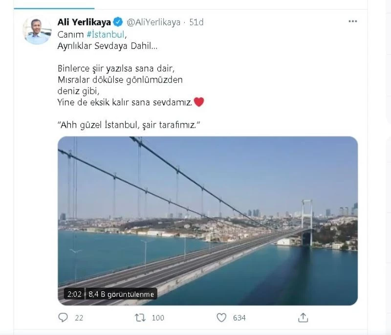 İstanbul Valisi Ali Yerlikaya, kısıtlama nedeniyle boş kalan İstanbul’un simge mekanlarının drone ile çekilmiş görüntülerini sosyal medya hesabından paylaştı. Yerlikaya paylaşımda, “Canım İstanbul, ayrılıklar sevdaya dahil. Binlerce şiir yazılsa sana dair, mısralar dökülse gönlümüzden deniz gibi yine de eksik kalır sana sevdamız. Ahh güzel İstanbul, şair tarafımız” ifadelerini kullandı.
