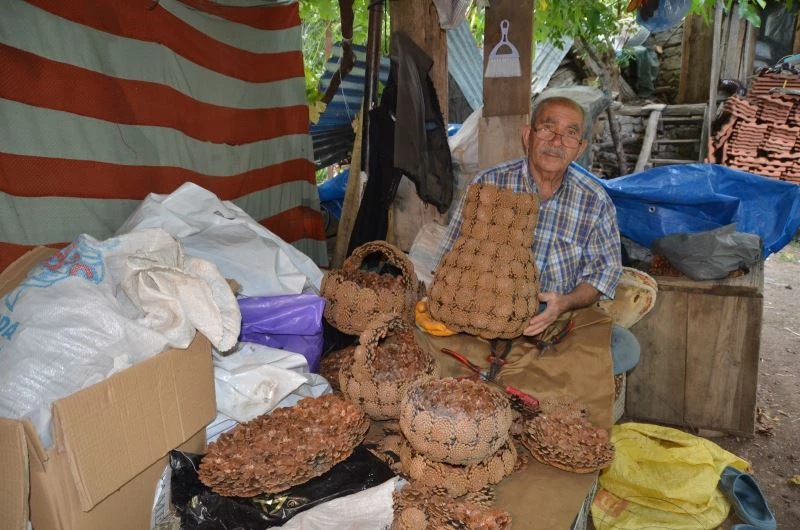 Antalya’nın Akseki ilçesinde yaşayan eski kaşıkçı ustası 86 yaşındaki Hasan Erdoğan, astım hastalığına şifa ararken meslek sahibi oldu. Erdoğan, evinin bahçesine kurduğu tezgahta 21 yıldır ormandan topladığı kozalakları işleyerek sepet, vazo, şekerlik, avize, meyve tabağı gibi süs eşyaları yapıyor.