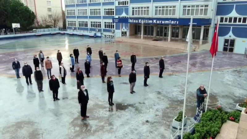 Milli Eğitim Bakanı Ziya Selçuk’un çağrısının ardından İstanbul’da yapılan bayrak töreni havadan görüntülendi. Okul bahçesinde yöneticiler ve görevli personeller hep birlikte İstiklal Marşı’nı okudu.