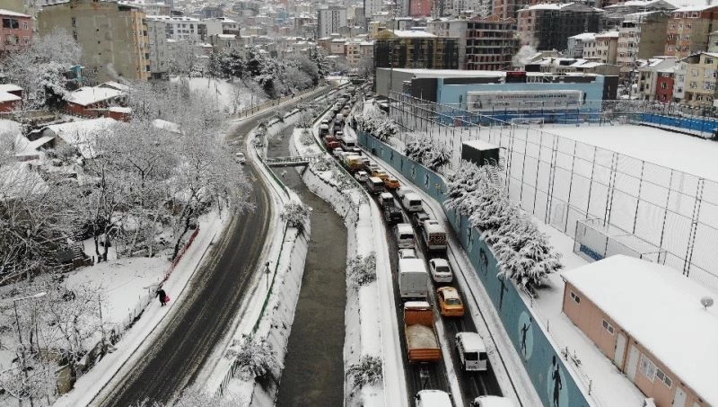 İstanbul’da sabah etkili olan kar yağışı trafiği olumsuz etkiledi. Aniden bastıran kar yağışı nedeniyle ara yollar adeta kilitlendi. Kağıthane’de kar yağışı nedeniyle oluşan trafik drone ile havadan görüntülendi.