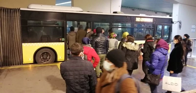 İstanbul’da akşam saatlerinde metrobüs duraklarında yoğunluk oluştu. Soğuk havada evlerine gitmeye çalışan vatandaşların zaman zaman sosyal mesafeye uymadıkları gözlendi.