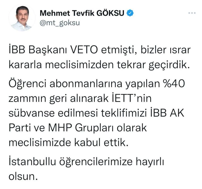 Esenler Belediye Başkanı Mehmet Tevfik Göksu, sosyal medya hesabından yaptığı açıklamada, "İBB Başkanı veto etmişti, bizler ısrar kararla meclisimizden tekrar geçirdik. Öğrenci abonmanlarına yapılan yüzde 40 zammın geri alınarak İETT’nin sübvanse edilmesi teklifimizi İBB AK Parti ve MHP Grupları olarak meclisimizde kabul ettik. İstanbullu öğrencilerimize hayırlı olsun" ifadelerini kullandı.
