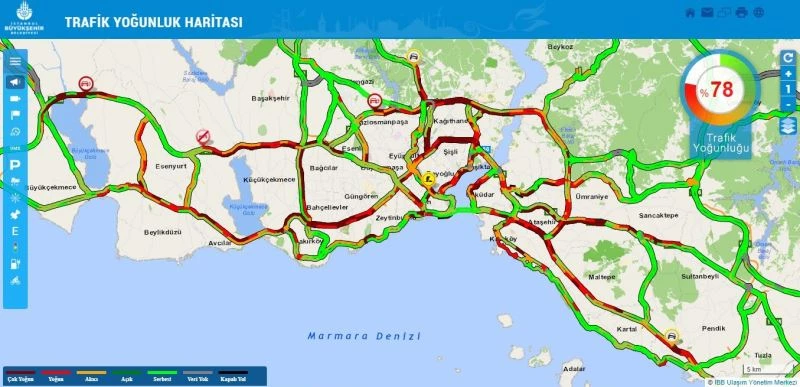 İstanbul’da etkili olan sağanak yağış sonrası trafik durma noktasına geldi. Kent genelinde trafik yoğunluğu saat 16.30 itibariyle yüzde 78’e ulaştı.