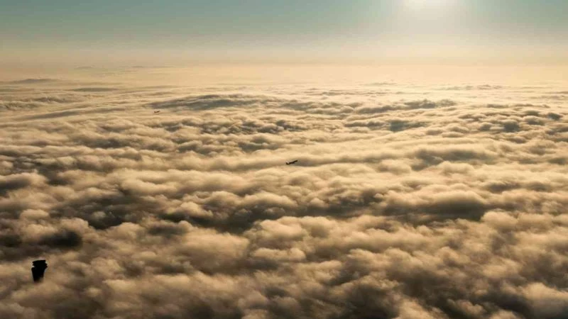 İstanbul’da sis bulutlarının içinden çıkan uçaklar, havadan görüntülendi