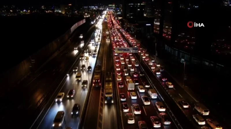 Korona virüs tedbirleri kapsamında hafta içi her akşam uygulanan sokağa çıkma kısıtlamasına saatler kala İstanbul’da yüzde 72 seviyelerine ulaşan trafik yoğunluğu drone ile görüntülendi.
