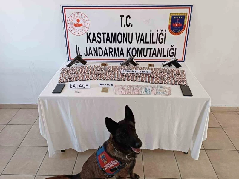 Edinilen bilgiye göre, Kastamonu İl Jandarma Komutanlığı ekiplerince uyuşturucu madde ticaretinin önlenmesine yönelik gerçekleştirilen çalışmalar neticesinde, İstanbul’dan Kastamonu’nun Tosya ilçesine piyasaya sürmek üzere uyuşturucu madde getirdikleri tespit edilen A.B. ve H.Y. isimli şahısların üzerinde ve evlerinde uyuşturucu madde arama köpeği ‘Yekten’ ile arama yapıldı. Yapılan aramada bin 787 adet sentetik hap, 15 gram toz esrar, 7 adet extacy hap, 3 adet ruhsatsız tabanca ve 19 adet fişek ele geçirildi.