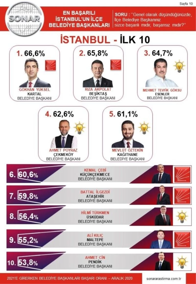 1 Kasım - 27 Aralık 2020 tarihinde yapılan ankette katılanlara "Genel olarak düşündüğünüzde, İlçe Belediye Başkanınız sizce başarılı mıdır?” sorusu soruldu. 20 büyükşehir belediyesinin 7 tanesinde yüz yüze, 13’ünde ise telefonla yapılan ankette “İstanbul’un En Başarılı İlce Belediye Başkanları” sıralamasında Kartal Belediye Başkanı Gökhan Yüksel yüzde 66,6 ile en başarılı seçilirken, Beşiktaş Belediye Başkanı Rıza Akpolat yüzde 65.8’lik oranla ikinci, Esenler Belediye Başkanı Mehmet Tevfik Göksu yüzde 64.7’lik oranla üçüncü sırada yer aldı.