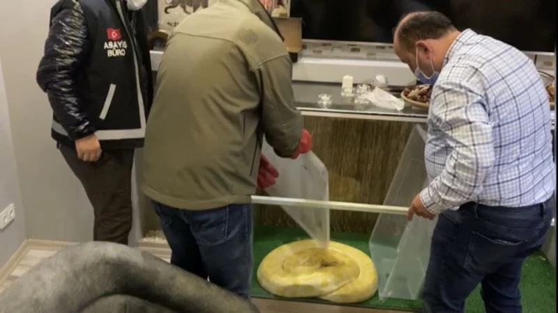 Salonda aramalara devam eden Beyoğlu polisi, cam fanusun içerisinde 3 metre uzunluğunda bir piton görünce şoke oldu. Gördükleri manzara karşısında şaşıran polis ekipleri durumu Doğa Koruma ve Milli Parklar Müdürlüğü’ne bildirdi. Kısa sürede gelen ekiplerin müdahalesiyle cam fanustan alınan piton yılanı güçlükle plastik kutuya konuldu.