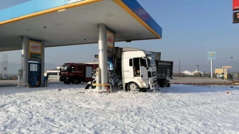 Sakarya’nın Pamukova ilçesinde kontrolden çıkan tır akaryakıt istasyonuna daldı. Facianın eşiğinden dönülen olayda, akaryakıt istasyonuna dalıp pompaya çarptığı anlar saniye saniye güvenlik kamerasına yansıdı.