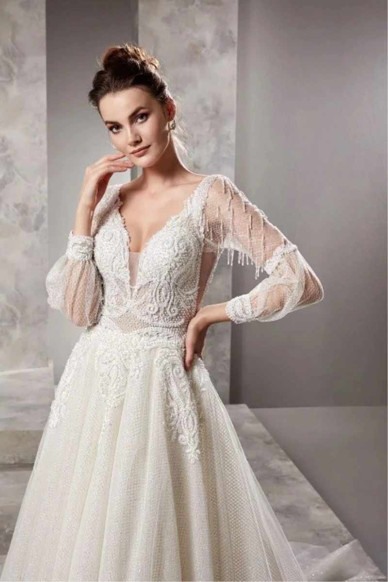 Derin V Yaka Uzun Kol Ekose Tül Etek Helen Gelinlik