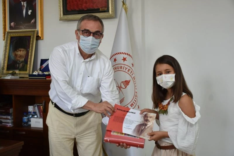 Öte yandan Kozabirlik İlkokulu Müdürü Hüseyin Çetinkaya’nın da bulunduğu kabulde İl Müdürü Akyol, öğrenciye ödülünü takdim etti.