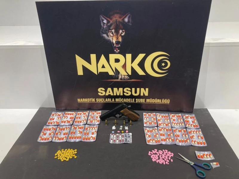 Olay, Samsun’un Canik ilçesi Yenimahalle’de meydana geldi. Edinilen bilgiye göre, Samsun Emniyet Müdürlüğü Narkotik Suçlarla Mücadele Şube Müdürlüğü ekipleri, çalışmakta olduğu işyerinden irtibatlı olduğu şahıslara uyuşturucu madde satışı yaptığı istihbar edinilen H.K.’yi takibe aldı. Söz konusu işyerine düzenlenen operasyonda gözaltına alınan K.H. ile birlikte 104 adet ecstasy hap, 240 kapsül sentetik ecza, 3 paket halinde toplam 0,52 gram metamfetamin maddesi, 1 adet 9 mm çapında ruhsatsız tabanca, 4 adet 9 mm çapında tabanca fişeği ile 1 adet uyuşturucu madde satışında kullanıldığı değerlendirilen makas ele geçirildi. Olayla ilgili soruşturma başlatıldı.