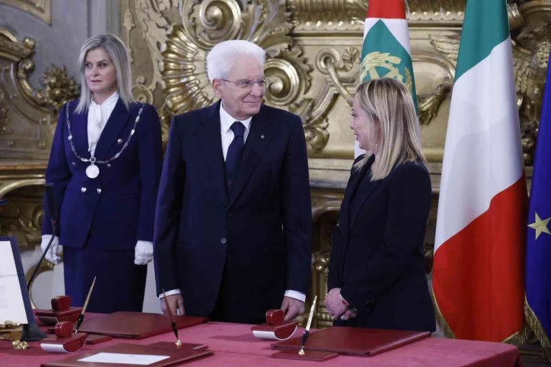 İtalya’da seçimleri kazanarak yeni hükümeti kuran Başbakan Giorgia Meloni ve 24 bakanı için başkent Roma’daki Cumhurbaşkanlığı Sarayı Quirinale’de yemin töreni düzenlendi. Meloni ve lideri olduğu sağ koalisyonun 24 bakanı törende Cumhurbaşkanı Sergio Mattarella’nın huzurunda tek tek yemin etti. Yemin törenin ardından Başbakan Meloni ve tüm bakanlar, Cumhurbaşkanı Mattarella ile fotoğraf çektirdi.