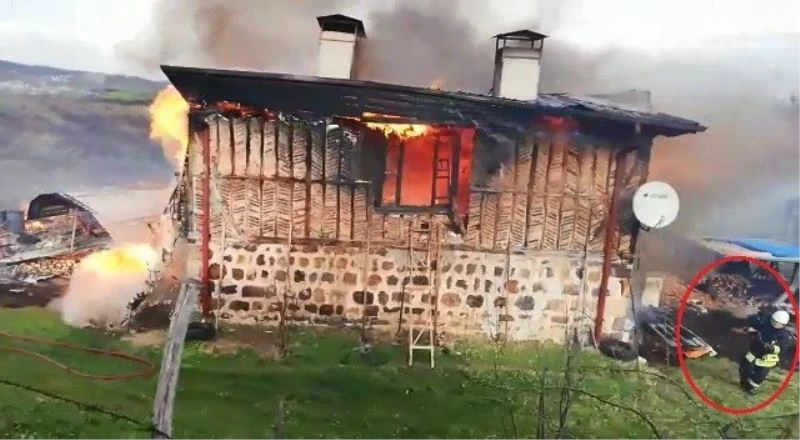 Yangın ihbarı ile olay yerine gelerek alevlere müdahale eden itfaiye ekipleri ise ölümden döndü. Söndürme çalışmaları sırasında alev alev yanan ev aniden çöktü. Çökme anını fark eden bir itfaiye eri ise elindeki hortumu bırakarak hızla evden uzaklaştı. Olayda yara almayan itfaiye ekipleri, daha sonra yangın söndürme çalışmalarına devam etti.