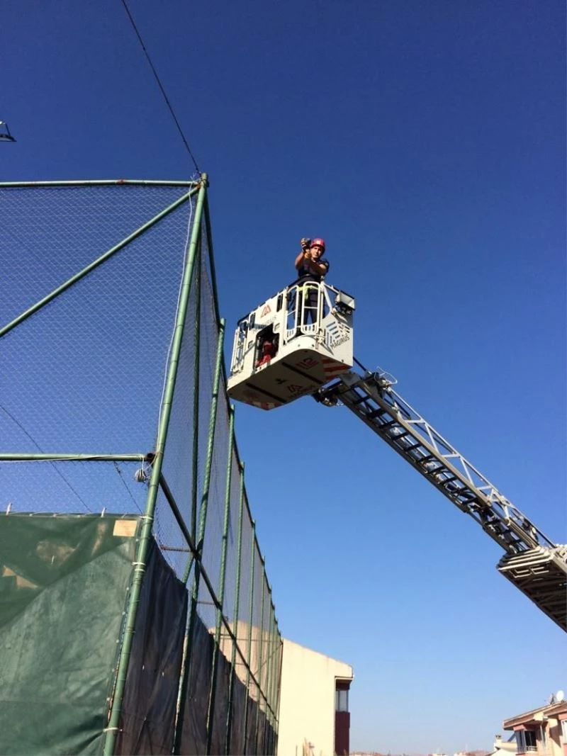 Balıkesir’in Bandırma ilçesinde itfaiye ekipleri halı sahanın çitlerine takılan bir kuşu kurtardı.