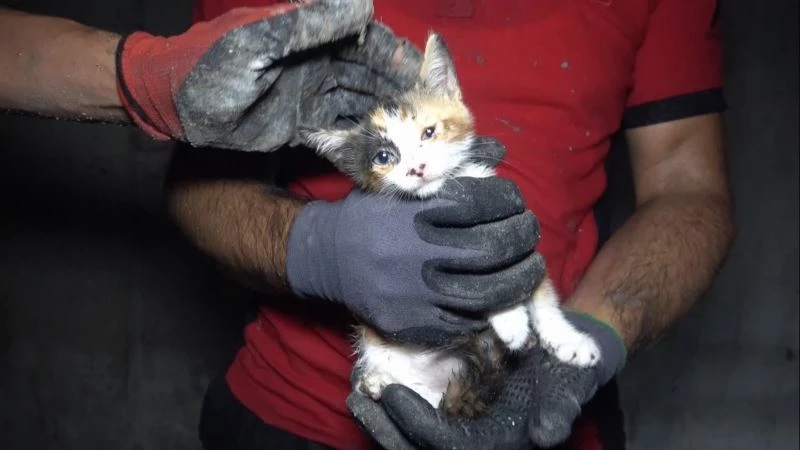 Mersin’in Erdemli ilçesinde 2 apartmanın arasından geçen eski kanalizasyon hattına düşen yavru kedi, itfaiyenin 4 saatlik operasyonu sonucunda kurtarıldı.