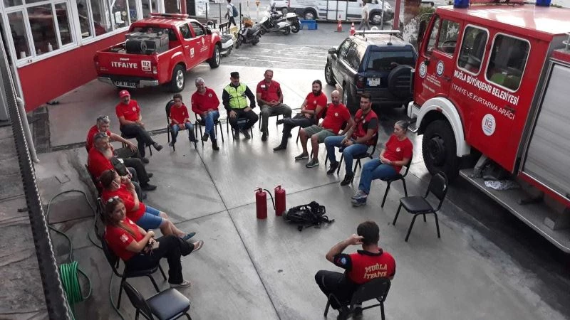 Muğla 911 Arama Kurtarma ve Araştırma Derneği gönüllüleri, itfaiye görevlilerinden yangın söndürme eğitimi aldı.