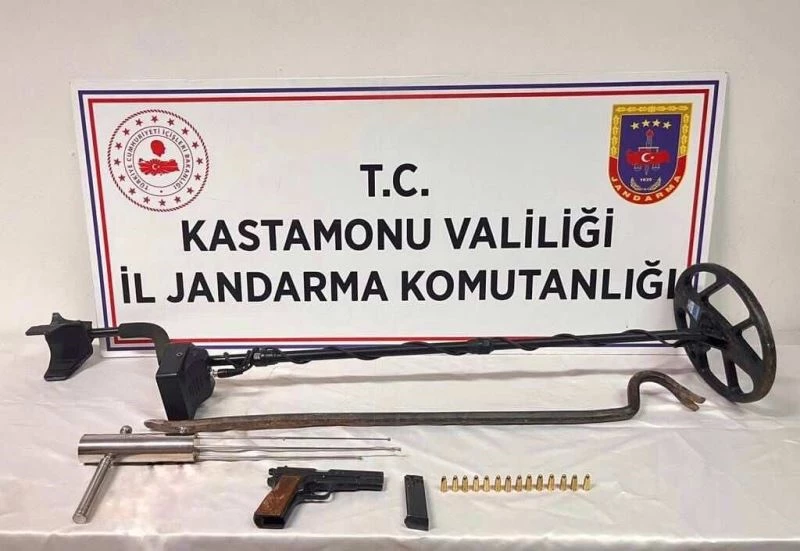 Edinilen bilgiye göre, Kastamonu İl Jandarma Komutanlığınca tarihi eser kaçakçılığının önlenmesine yönelik yapılan çalışmalar neticesinde E.K. ve T.D. isimli şahıslar, Kastamonu’nun Merkez ilçesinde define bulmak maksadıyla izinsiz kazı yaptıkları esnada suçüstü yakalandı. Şahıslarla birlikte jandarma ekiplerince yapılan aramada 1 adet ruhsatsız tabanca, 1 adet arama dedektörü, 4 adet altın arama çubuğu ve 14 adet tabanca mermisi ele geçirildi.