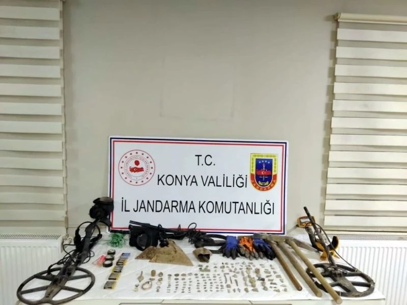 Konya’nın Beyşehir ilçesinde izinsiz kazı yaptığı iddia edilen 3 kişi, kazı malzemeleri ve çok sayıda değişik objelerle jandarmaya yakalandı.
