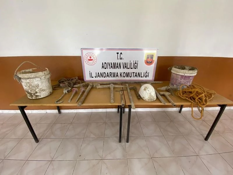 Edinilen bilgilere göre, Adıyaman’ın Tut ilçesine bağlı Yaylımlı Köyünde izinsiz kazı yapan şahısların ihbarını alan jandarma ekipleri kısa sürede harekete geçerek belirtilen bölgeye gitti. Burada kazı yapan M.A., ile A.A., isimli 2 şahsı yakalayarak gözaltına aldı. Jandarma ekipleri aynı zamanda kazı esnasında kullanılan 4 adet kazma, 2 adet demir murç, 1 adet çekiç, 1 adet manivela, 1 adet keser, 1 adet baret, 1 adet tahra, 1 adet kancalı makara, 4 adet kova, 5 metre tahta merdiven, 20 metre halatta ise el koydu.