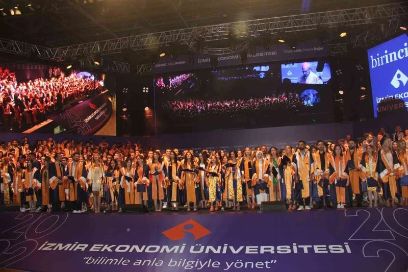 İzmir Ekonomi Üniversitesi 2021-2022 Akademik Yılı mezuniyet törenleri, kampüs içindeki amfitiyatroda gerçekleştirildi. Bu dönem toplamda bin 501 öğrencisini mezun eden İEÜ, mezuniyet törenlerini 4 güne böldü. Heyecan ve coşkunun hiç eksilmediği törende keplerini havaya fırlatan gençler, eğitimlerini başarıyla tamamlayarak yeni bir hayata adım atmanın mutluluk ve gururunu yaşadı. İEÜ İngilizce Mütercim ve Tercümanlık Bölümü mezunu Aslı Melike Soylu, üniversite birincisi olurken, sosyoloji bölümünden Elif Yubaş üniversite ikincisi, uluslararası ticaret ve finans bölümünden Hakan Berkay Yavuz da üniversite üçüncüsü olarak büyük başarı elde etti. Dereceye giren öğrencilere ödüllerini, İEÜ Mütevelli Heyet Başkanı Mahmut Özgener ve Rektör Prof. Dr. Murat Aşkar takdim etti. Tören sonunda ise mezun olan tüm gençler, Rektör Aşkar ile birlikte, bu yıl ilk kez hazırlanan ‘İzmir Ekonomi Üniversitesi Andını’ okudu.