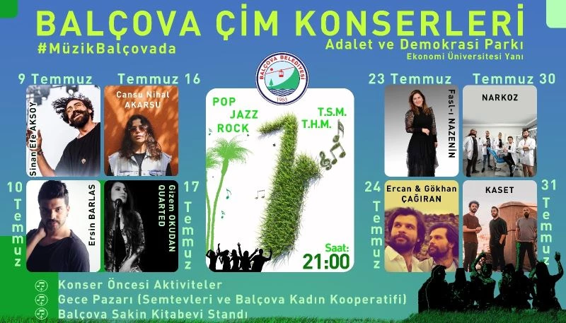Bir yılı aşkın süredir devam eden korona virüsü kısıtlamaları nedeniyle müziğe hasret kalan İzmirliler, Balçova Belediyesinin düzenleyeceği çim konserlerinde buluşacak. 9 Temmuz Cuma akşamı ilki düzenlenecek olan konserler, bir ay boyunca her hafta cuma ve cumartesi günleri İzmir Ekonomi Üniversitesi yanındaki Balçova Adalet ve Demokrasi Parkında geçekleşecek. Konser alanında ayrıca Semt evlerinin gece pazarı ve kitap standı da olacak.