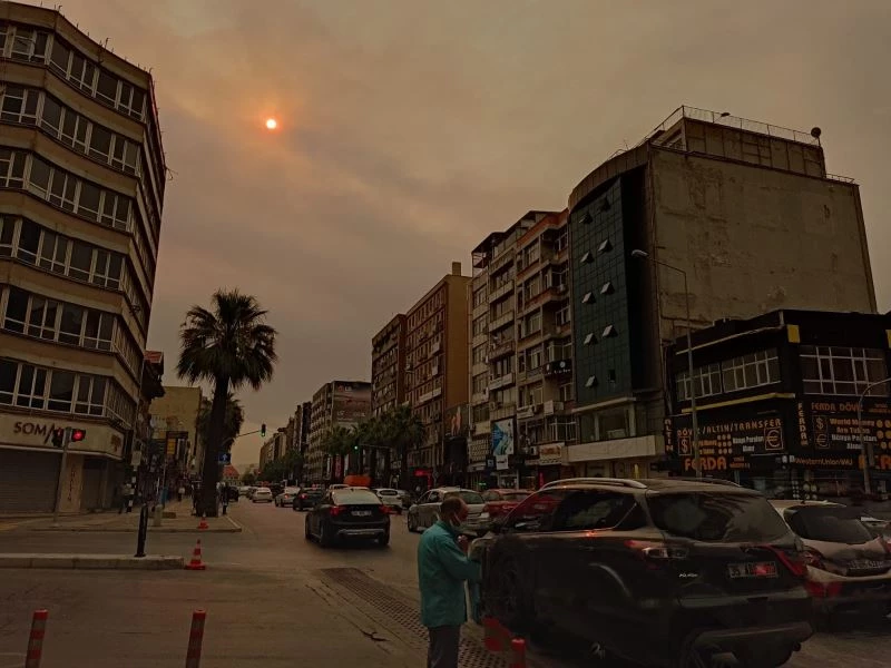 Türkiye orman yangınları ile mücadele ederken, İzmirliler de tedirgin eden bir sabaha uyandı. İzmir’de sarı ve kızıllığın hakim olduğu gökyüzü dikkat çekti, pek çok sosyal medya kullanıcısı Twitter’da paylaşım yaparak havadaki rengin sebebini sordu. Paylaşımlar nedeniyle İzmir, trend topic listesinin üst sırasına yerleşti. Meteoroloji 2. Bölge Müdürlüğünden alınan bilgiye göre, bu durumun sebebinin orman yangınları olduğu ifade edildi. Edinilen bilgide, orman yangını nedeniyle meydana gelen yoğun duman ve partiküllerin güneyli rüzgar akışlarıyla taşındığı, bu sebeple atmosferdeki parlaklığın bozulduğu bildirildi. Havadaki sarı ve kızıl rengin, güneyli rüzgar akışının gün boyu devam edecek olması nedeniyle tüm gün sürebileceği, yağışın ise olmayacağı belirtildi. Öte yandan, güneşin kızıl renkte olması da dikkat çekti.