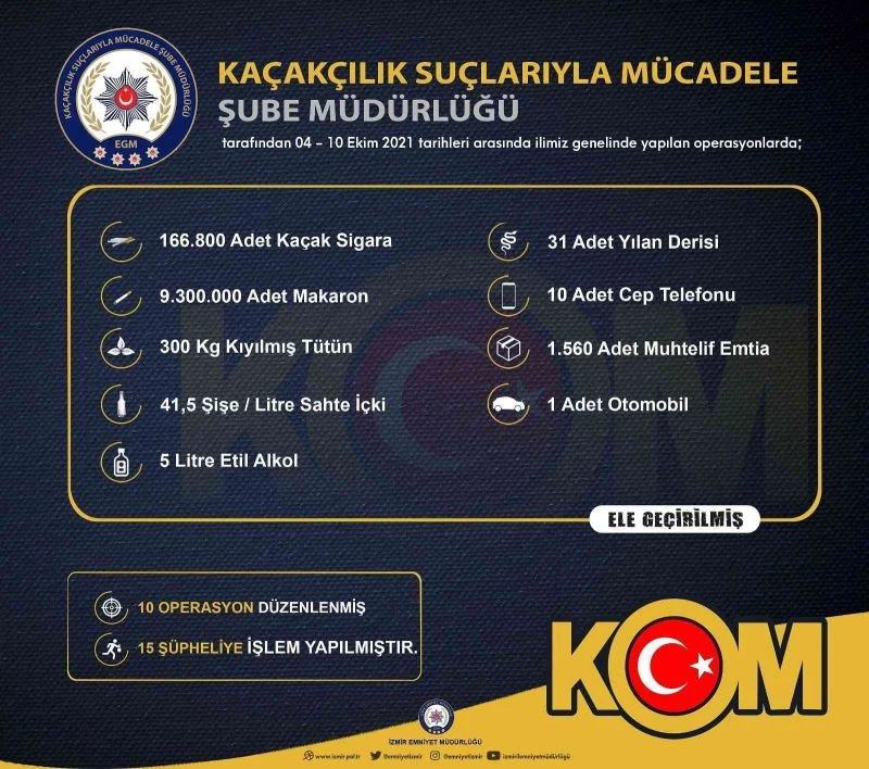 İzmir İl Emniyet Müdürlüğü Kaçakçılık Suçlarıyla Mücadele Şube Müdürlüğü ekipleri, il genelinde 4-10 Ekim tarihleri arasında 10 ayrı operasyon gerçekleştirdi. Operasyonlarda adreslerde yapılan aramalarda 166 bin 800 adet kaçak sigara, 9 milyon 300 bin makaron, 300 kilogram tütün, 41,5 litre sahte içki, 5 litre etil alkol, 31 yılan derisi, 10 cep telefonu, bin 560 elektronik malzeme ve otomobil ele geçirildi. Olaylarla ilgili 15 şüpheli hakkında işlem başlatıldı.