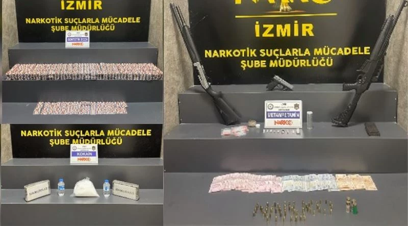 İzmir İl Emniyet Müdürlüğü Narkotik Suçlarla Mücadele Şube Müdürlüğü ekipleri, 19-25 Mart tarihleri arasında il genelinde 69 ayrı operasyon gerçekleştirdi. Adreslerde yapılan aramalarda, 6 kilo 490 gram esrar-skank, 3 kilo 251 gram kokain, 799 gram metamfetamin, 371 gram sentetik kannabinoid (bonzai vb.), 16 bin 528 adet sentetik ecza, çeşitli uyuşturucu türlerinden satışa hazır hale getirilmiş vaziyette bir miktar uyuşturucu madde, 8 adet hassas terazi, 6 adet tabanca, 2 adet tüfek, 86 adet tabanca/tüfek fişeği ve suçtan elden edilen 111 bin 170 Türk Lirası ele geçirildi.