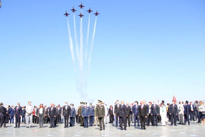 Çelenk koyma töreninin ardından Türk Yıldızları ve Solo Türk İzmir semalarında selamlama uçuşu gerçekleştirdi. Solo Türk’ün gökyüzüne ay-yıldız çizdiği anları ise İzmirliler hayranlıkla izledi.
